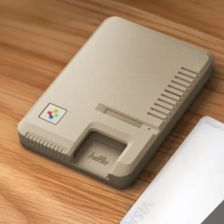 Дизайн буквально кричить «Apple 1984»: бежевий корпус нагадує оригінальний Macintosh, а піксельний напис “hello” на передній панелі, мотив дискети та райдужні акценти відсилають до класичних логотипів Apple. Прямокутна форма гаманця повторює обриси комп’ютера, а ззаду вбудована мікро-тиснена вентиляційна решітка, яка не лише стильно виглядає, а й нагадує естетику оригінального Macintosh.